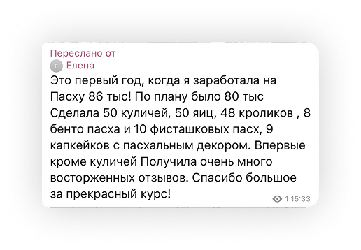 Многие из моих учениц готовили куличи вперые. Я предлагаю простые и понятные рецепты, поэтому они получаются с первого раза, даже у новичка! При этом, вы и ваши клиенты останетесь довольны вкусом и воздушной текстурой куличей.